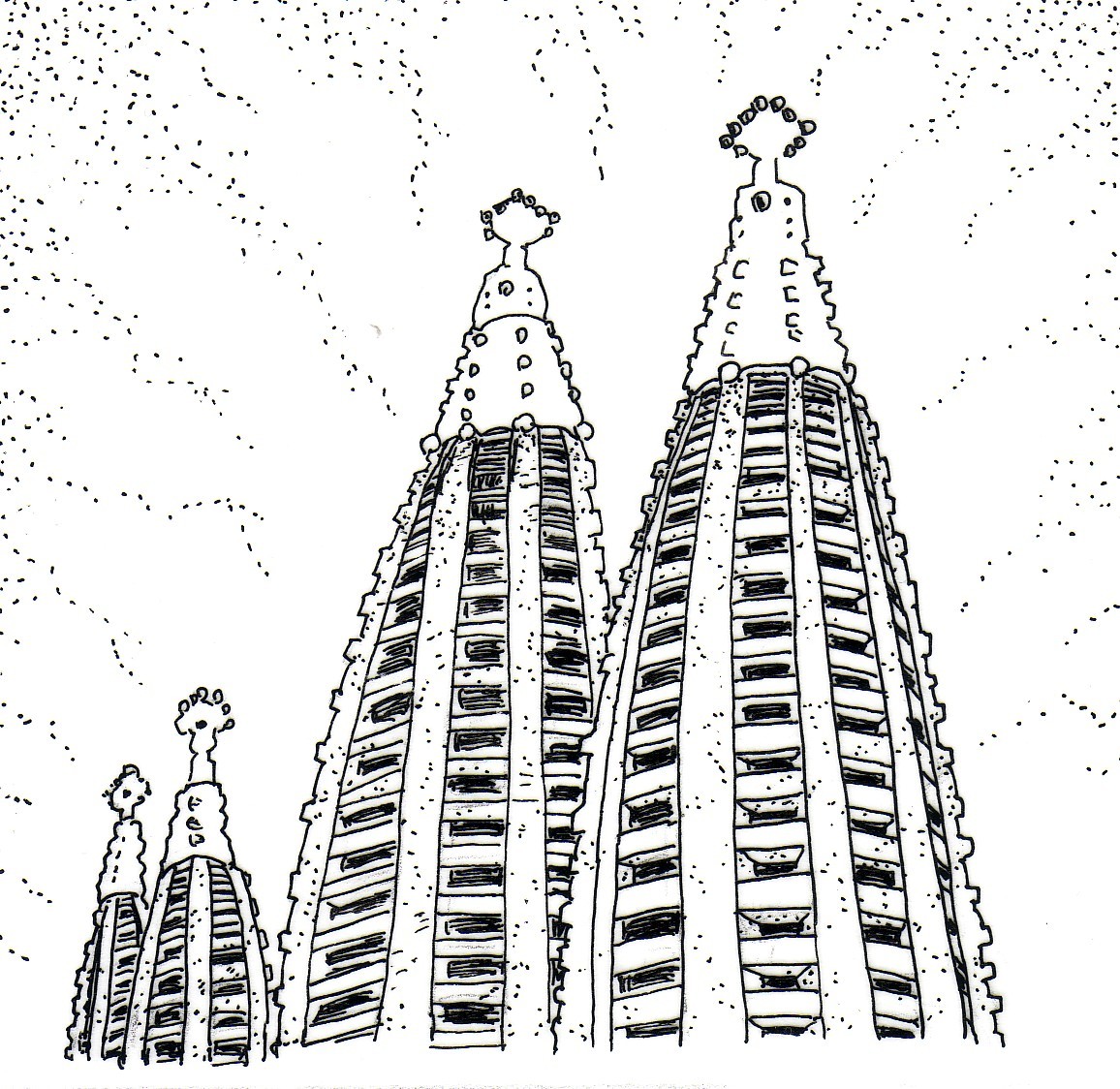 まるで砂で作られたロケットのように見える尖塔は、市内の至る所から望むことができる。